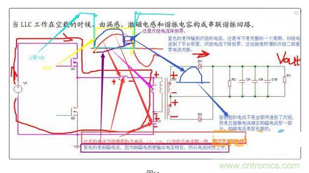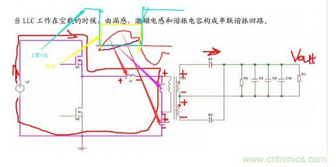 注意不同顏色畫的驅動、Vds、電流波形。諧振腔電流紅色的是諧振腔總電流,紫色的是勵磁電流,因為次級二極管導通,Lm端電壓被鉗位到n*(Vout-Vf),所以勵磁電流是線性上升的。