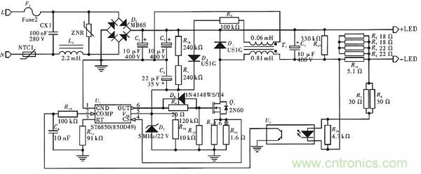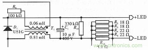 如圖2所示,此電路通過變壓器輸出適當的電流,當有LED負載時,電路中通入適當的電流和頻率使LED正常工作;當沒有負載時,變壓器中仍然殘留有能量,需要釋放。此時由R17等構成的回路,可以慢慢地釋放變壓器中的電能。但當電流突然減小時,變壓器中會產生感應電動勢,由此會產生較高的反向電壓,可能會擊穿器件。為了克服這個問題,在線圈的兩端并聯一個續流二極管D1,同時在電路輸出端串聯R15,并且在R15兩端并聯R2,R3,R4,R6。R15有降壓作用,并且能為反饋電路提供電壓。由于R15承受的功率較大,容易燒壞,所以預備一個由R2,R3,R4和R6的并聯等效電阻,這樣每個電阻承受的功率變小,在增加使用壽命的同時,能夠減少維修費用。