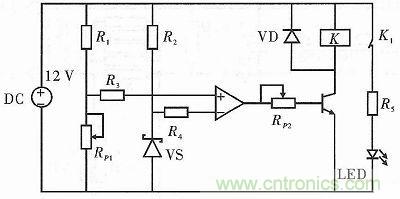 合理的蓄電池充放電,不僅可以延長蓄電池壽命,且能提升整個電路系統的穩定性。因此需要設計保護電路,以保證蓄電池能在一定的電壓范圍內進行充放電。本項目使用3級級聯的12 V鉛酸蓄電池。由于過充電路與過放電路有相似性,本文只給出蓄電池的過放電路,如圖5所示。電源電壓正常時,調節電位器RP1使放大器的同相輸入端的電位略高于反相輸入端的電位,此時放大器輸出低電平,VT截止,電路正常工作。當電源電壓<10.5 V時,反相輸入端的電位大于同相輸入端的電位,放大器會輸出高電平,調節RP2,使VT導通,此時負載與電源斷開。