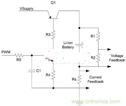 通過控制串聯(lián)導通晶體管Q1的偏置實現(xiàn)對充電電流的控制。可使用數(shù)模轉換器(ADC)或脈寬調制器(PWM)配合外部RC低通濾波器來控制偏置。線性方法適用于充電電流(<1A)較低的情況,因為串聯(lián)導通元件會面臨功率消耗問題。