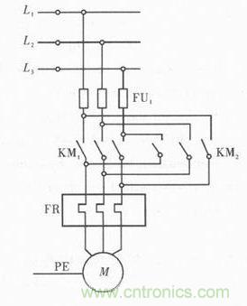 在眾多的操作系統(tǒng)中均要求電動(dòng)機(jī)能夠?qū)崿F(xiàn)正反轉(zhuǎn)給操作,從電動(dòng)機(jī)的工做原理中可知,需將三相電源中的任意兩個(gè)進(jìn)行對調(diào),就能實(shí)現(xiàn)電動(dòng)機(jī)的反向運(yùn)轉(zhuǎn),因此電動(dòng)機(jī)實(shí)現(xiàn)正反轉(zhuǎn)的實(shí)質(zhì)便是電源進(jìn)線的調(diào)換。但若僅調(diào)換進(jìn)線,容易導(dǎo)致電源短路,因此必須設(shè)置互鎖,圖2是三相異步電動(dòng)機(jī)正反轉(zhuǎn)的原理設(shè)計(jì)圖,圖中KM1和KM2均是交流接觸器主觸頭,當(dāng)KM1吸合時(shí),KM2交流接觸器主觸頭就會(huì)斷開,然后便可實(shí)現(xiàn)電機(jī)的正轉(zhuǎn)。若是斷開交流接觸器主觸頭KM1,KM2就會(huì)吸合,此時(shí)電動(dòng)機(jī)則會(huì)實(shí)現(xiàn)反轉(zhuǎn),圖中的FU1主要用于防止電源短路,圓形代表電機(jī)M。