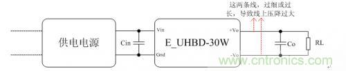 根據(jù)數(shù)據(jù)手冊要求連接E2405UHBD-30W電源模塊外圍電路,負(fù)載使用電子負(fù)載儀加滿載,供電電源使用可編程直流電源。模塊上電,電子負(fù)載儀上顯示的電壓值不是5.0V,而是4.7V,然而在測量電源模塊輸出引腳兩端的電壓值是5.0V。什么原因呢?E2405UHBD-30W模塊滿載時(shí),輸出電流有6A,而模塊引腳到負(fù)載儀端口之間的連接線太長了,使得連接線的阻抗值大。如果阻抗為0.05歐姆,那么連接線上的電壓差為0.05Ω*6A=0.3V,這個(gè)就是模塊輸出引腳到負(fù)載儀端口的壓差。