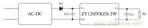 AC-DC電源模塊輸出電壓為12V,最大輸出電壓精度為±3%,那么輸出電壓范圍是11.64V~12.36V。而二極管D1使用1N4148,正向?qū)▔航禐?.7V,那么ZY1205FKES-3W模塊實(shí)際輸入電壓的范圍只有為10.94V~11.66V,這個(gè)電壓范圍還是在ZY1205FKES-3W模塊的輸入電壓范圍內(nèi),模塊可以正常工作,只是輸出電壓會較低。