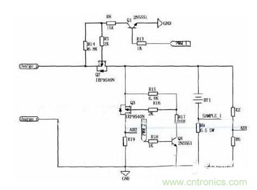 根據(jù)三路AD采樣結(jié)果確定充電器的充電狀態(tài)后,由單片機(jī)輸出兩路占空比可調(diào)頻率為1kHz的PWM波形PWM1和PWM2分別用來控制兩只三極管2N5551的導(dǎo)通程度,三極管集電極電流會(huì)隨著不同,再經(jīng)電阻分壓后提供不同的電壓給場效應(yīng)管的柵極,驅(qū)動(dòng)MOSFET,輸出不停大小的漏極電流Id,給蓄電池提供大小不等的充電電流和放電脈沖幅值,最終達(dá)到脈沖充電的效果。