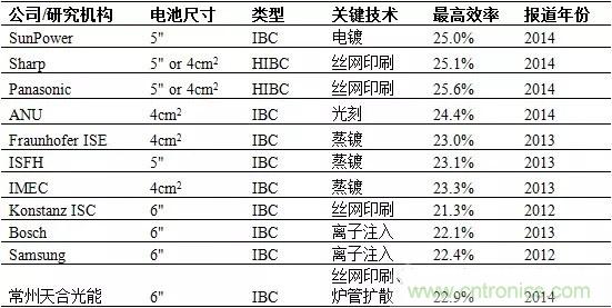 在IBC結構上,SunPower公司的研發遙遙領先,其它研究成果如德國FraunhoferISE的23%,ISFH的23.1%,IMEC的23.3%等等。最近,日本的研發人員將IBC與異質結(HJ)技術相結合,在2014年將晶體硅電池的效率突破到25%以上。其中日本Sharp和Panasonic公司將IBC與HJ技術結合在一起,研發的晶硅多結電池效率分別達到25.1%和25.6%。