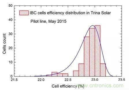 同年,由常州天合光能光伏科學與技術國家重點實驗室獨立研發的6英寸大面積IBC電池效率已達22.9%,成為了6英寸IBC電池的最高轉換效率。同時,天合光能依托國家863項目建成中試生產線,進入2015年后,天合光能科研人員采用最新開發的工藝,在中試生產線做出了平均22.8%,最高23.15%(內部測試)的結果,大部分電池效率在22%以上,如圖1所示,達到了目前工業級6英寸晶體硅電池效率的最高水平(SunPower電池均為5英寸)。
