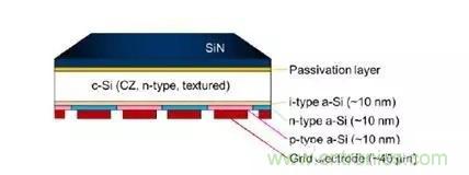 采用IBC與HJ技術結合的HIBC技術可以使電池效率進一步提升,其結構如圖4所示,在硅片表面同時采用本征的非晶硅進行表面鈍化,在背面分別采用N型和P型的非晶硅薄膜形成異質結。其優點是利用非晶硅優越的表面鈍化性能,并結合IBC結構沒有金屬遮擋的結構優點,采用相同的器件結構,日本松下和夏普公司目前取得了25.6%和25.1%的電池效率,這將成為未來IBC電池的重要方向。