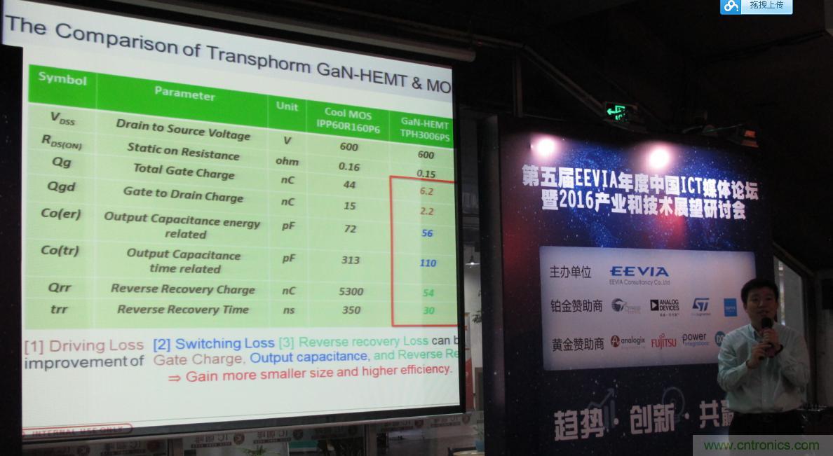 富士通電子元器件高級市場經理蔡振宇(Eric)的“氮化鎵產品主要的應用場景和未來的趨勢”主題分享,將富士通電子旗下代理產品線Transphorm公司獨特GaN技術和產品方案第一次帶到中國媒體面前,采用創新的Cascode結構的HEMT高壓產品讓Transphorm在氮化鎵功率表技術領域劍走偏鋒,成為該陣營的領頭羊。