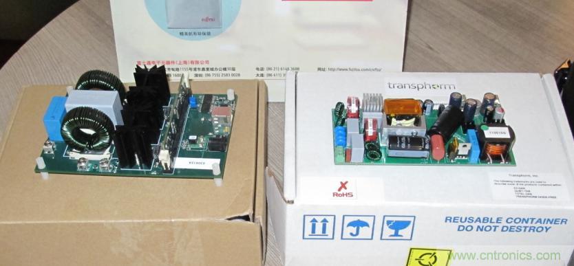 在演講現場,富士通電子展示了兩款基于HEMT器件的電源模塊方案。“我們的PFC+LLC電源與類似的競爭方案相比,電路板尺寸可以縮減45%,在滿載和10%的負載下,我們可以分別提高1.7%和3%的效率。對于很多效率要求苛刻的應用來說,這是一個非常大的提升。”Eric指出。