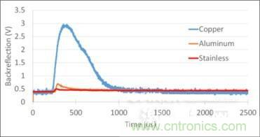 (圖片說明:在進(jìn)行不銹鋼、鋁和銅金屬板打孔時(shí)從工件返射的激光信號(hào)示例。)