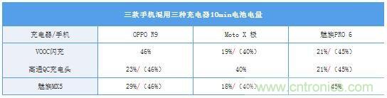 測試手機:OPPO R9、Moto X 極、魅族PRO 6,充電頭:VOOC閃充頭、高通官方QC充電頭、魅族MX5充電頭(UP1220)。其中(OPPO R9應搭配VOOC閃充頭使用:VOOC閃充協議);(Moto X 極應搭配高通官方QC充電頭使用:QC2.0快充協議);(魅族PRO 6應搭配MX5充電頭使用:聯發科PEP快充協議)。