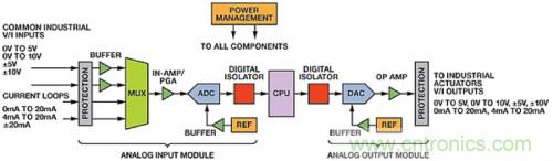 典型模擬I/O模塊包括2個、4個、8個或16個通道。為滿足嚴格行業標準,這些模塊需要提供過壓、過流和EMI浪涌保護。大多數PLC包括ADC和CPU之間、CPU和DAC之間的數字隔離。高端PLC可能還有國際電工委員會(IEC)標準規定的通道間隔離。 很多I/O模塊包括每通道軟件可編程單端或差分輸入范圍、帶寬和吞吐率。