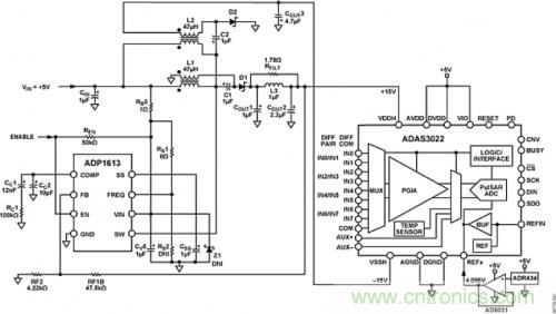 ADP1613用作單端初級原邊電感(SEPIC) Cuk轉換器,是ADAS3022在外部5 V電源供電情況下,為其提供20 mA時所需±15 V高壓電源以及最大值為3 mV的低輸出紋波的理想選擇。本應用中,ADP1613的開關頻率為1.3MHz。如圖3所示,ADP1613盡可能地減少了外部元器件數目,并且具有超過86%的效率,因此它能滿足ADAS3022的規格要求。在該拓撲中使用低成本ADP1613的最大優勢,是它在兩條供電軌之間的出色跟蹤能力,同時使用現成的耦合電感可產生±15 V電壓。除此之外,還能通過ADIsimPower設計工具輕松快捷地完成設計制造。