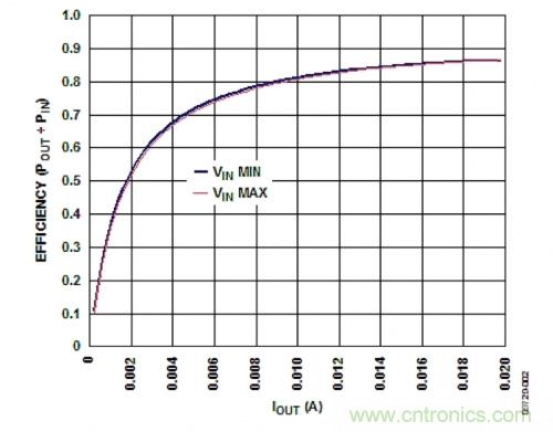 圖3. ADP1613的效率(POUT/PIN)與輸出電流(IOUT)的關系
