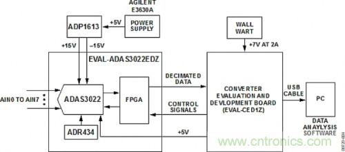 測試設置的功能框圖如圖4所示。ADP1613評估板由外部+5 V電源驅動,產生ADAS3022板所需的±15 V電壓。7 V直流壁式電源為EVAL-CED1Z板供電。EVAL-CED1Z板上的穩壓器提供ADAS3022板所需的5 V電源。運行交流測試時,采用Audio Precision SYS-2702產生低失真輸入信號。
