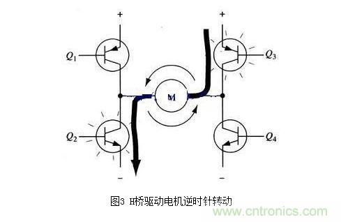 圖3所示為另一對(duì)三極管Q2和Q3導(dǎo)通的情況,電流將從右至左流過電機(jī)。當(dāng)三極管Q2和Q3導(dǎo)通時(shí),電流將從右至左流過電機(jī),從而驅(qū)動(dòng)電機(jī)沿另一方向轉(zhuǎn)動(dòng)(電機(jī)周圍的箭頭表示為逆時(shí)針方向)。