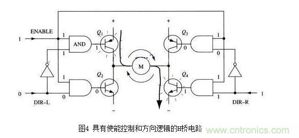 改進(jìn)電路在基本H橋電路的基礎(chǔ)上增加了4個(gè)與門和2個(gè)非門。4個(gè)與門同一個(gè)“使能”導(dǎo)通信號(hào)相接,這樣,用這一個(gè)信號(hào)就能控制整個(gè)電路的開關(guān)。而2個(gè)非門通過提供一種方向輸人,可以保證任何時(shí)候在H橋的同側(cè)腿上都只有一個(gè)三極管能導(dǎo)通。(與本節(jié)前面的示意圖一樣,圖4所示也不是一個(gè)完整的電路圖,特別是圖中與門和三極管直接連接是不能正常工作的。)