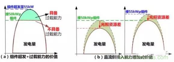 如正面案例所述,當輻照度或溫度等環(huán)境條件變化時,組件輸出功率會超過規(guī)格書中標定的最大功率,即“組件超發(fā)”,此種情況通常發(fā)生在部分光照資源較好的部分Ⅰ類資源區(qū),這就要求逆變器需具備將組件能量全部轉(zhuǎn)化的能力,即對逆變器“吐”的能力要求較高。否則將會出現(xiàn)棄光的現(xiàn)象,降低發(fā)電量,影響用戶收益,如圖2(a)所示。