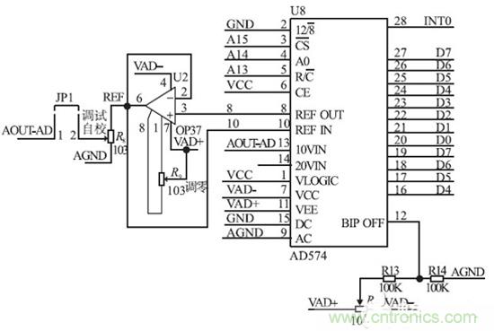 A/ D 采樣輸入電路如圖4 所示。為了滿足取樣精度需要,我們選擇12 bit A/ D 轉換器和12 bitD/ A 轉換器,使步進小于1 mA,在電路中A/ D 啟動后,先讀高8 位結果,再讀后4 bit;D/ A 是先寫入高8 bit,再寫入低4 bit.