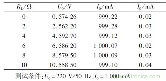 負載穩定性測試條件為U0 =220 V/50 Hz,I0 =1000 mA,測試數據如表2 所示,其中負載穩定度是指一定的工作情況下,負載變化引起的輸出電流變化。測試數據表明負載在0 ~10 贅變化時,輸出電流最大偏差為0. 99 mA,紋波電流小于0. 05 mA.