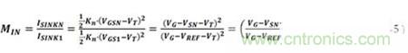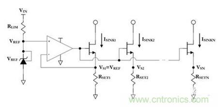 最終MOSFET(金氧半場效晶體管)源電壓VS以及RSET電阻決定著各柱上的灌電流(sink current);通過去除來自外部電流沉柱的反饋(即所有N》1),已失去對VSN的直接控制。因此,RSETN必須精心選擇以生成預期的任意第N個柱的灌電流,即ISINKN。仔細觀察上面的圖1,很容易得出定義偏置網絡第N個柱電流與第1個柱電流的比值的等式︰