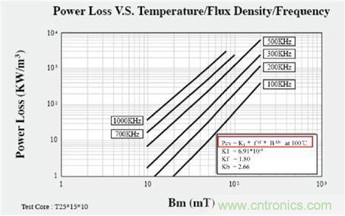 如圖4所示,變壓器鐵損是和開關頻率的kf次方成正比,又與磁性溫度的限制有關,所以隨著開關頻率的提高,高頻電流在線圈中流通產生嚴重的高頻效應,從而降低了變壓器的轉換效率,導致變壓器溫升高,從而限制開關頻率提高。