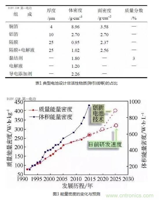 電池的能量密度基本由電池的正負極決定的,但光是正負極活性材料也不能保證電池能發上電,得有很多非活性物質,比如導電輔助劑、活性粉末之間的粘結劑、隔離膜、陰陽極的箔材、絕緣固定的膠紙、外邊鋁塑膜殼子或者鋼鋁殼等等(表1 典型電池設計非活性物質的占比)。我們的媒體,總喜歡搞大新聞,有意無意的忽略這部分物質的含量,得出的能量密度老能高到天上去,與事實相差較大,誤導無辜吃瓜群眾。其實,這部分相當重要,就拿過去十幾年的技術進步來說,我們電池的能量密度提升主要就是靠著活性物質占比的提升來實現的。