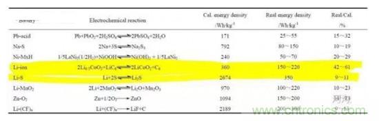 CRABTREE 2015年在The energy-storage frontier : Lithium-ion batteries and beyond中總結了過去25年松下18650電芯能量密度的變化。經過千辛萬苦,現在電芯實際R占比(Real/Cal.)已經達到了61%左右,實際電池系統加上管理系統、冷卻系統、引線等,成組實際能量密度會更進一步降低。下表例舉了一部分現有實際電池能量密度,可憐的明日之星鋰硫電池才10%左右的理論容量發揮;按照R max = 61%算,理論能量密度最高的鋰空的能量密度大概為3182 Wh/kg。