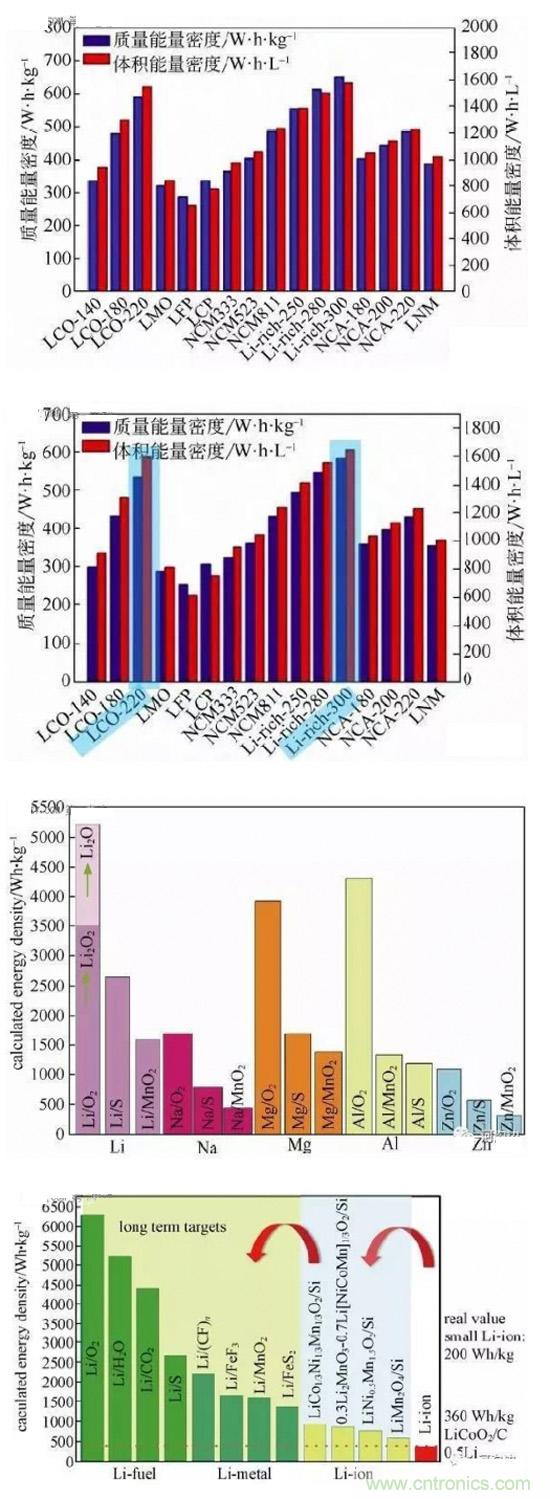 中科院的吳嬌楊博士對于選取了現有理論容量較高、理論容量較低但是商業化比較成熟等綜合性能比較好的正負極材料,進行正負極搭配,大致得出了結果:Li-rich-300 對Si-C-2000 的電芯體系,在所有的電池體系中具有最高質量能能量密度584 W·h/kg以及最高體積能量密度1645 W·h/L。該數值不包括封裝材料與極耳。