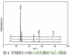 圖4是不同原料、相同制備工藝制成的三種人造石墨A、B、C的XRD圖譜,由圖4可知:A、B、C三種材料的主峰位置基本相同,均位于26°2θ角附近,說(shuō)明經(jīng)過高溫石墨化處理后的A、B、C三種材料形成了石墨晶體的六方晶型結(jié)構(gòu)。