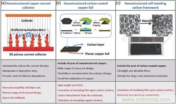 鋰粉末和表面改性的鋰箔可以作為平面鋰箔的替代物,以延遲枝晶的產(chǎn)生。負(fù)極的表面積大大增加以提供相當(dāng)大的沉積位置,從而在一段時(shí)間內(nèi)抑制枝晶生長(zhǎng)。然而,鋰箔的表面狀態(tài)和粉末之間的邊界不會(huì)持續(xù)很長(zhǎng)時(shí)間,并且整個(gè)箔在長(zhǎng)時(shí)間循環(huán)中會(huì)變成隨機(jī)分散的鋰微結(jié)構(gòu)的聚集體。相比之下,集流體(CCs)方法取得了較好的表現(xiàn),傳統(tǒng)銅箔被納米結(jié)構(gòu)化的材料代替。之后為了避免納米結(jié)構(gòu)銅的缺點(diǎn),開(kāi)發(fā)了碳涂覆的銅箔,這些碳涂層都貢獻(xiàn)了更好的電化學(xué)性能,這與其優(yōu)異的導(dǎo)電性、高比表面積和合適的孔徑/體積比具有密切的關(guān)系。與納米結(jié)構(gòu)或碳涂層銅箔相比,自支撐碳膜本身可直接作為CCs,能夠避免有機(jī)粘合劑或碳脫落產(chǎn)生的導(dǎo)電性所帶來(lái)的不利影響。