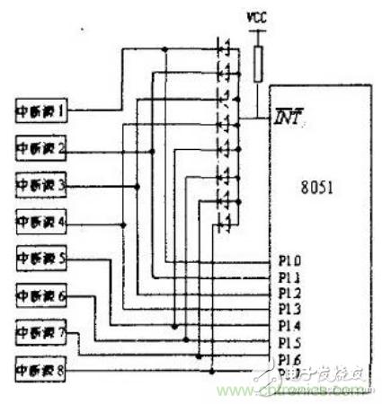 擴展的8個外部中斷源均通過二極管向I N T(x=0或I)請求中斷。當某個外部中斷源請求中斷服務時輸出低電平,單片機的I NT 經二極管接地電平,單片機滿足響應外部中斷(I N T)請求條件,響應中斷,程序立即轉向I NT 對應的中斷入口地址處開始執行中斷服務程序,通過軟件查詢PI.0~P1.7口外中斷源的狀態,以識別提出請求的外擴中斷源,并轉向中斷服務程序為其服務,其查詢順序即為外部擴展中斷源的中斷優先級順序。在圖中,是選用PI.0~PI.7作為外擴中斷源請求的狀態信息輸入端口。