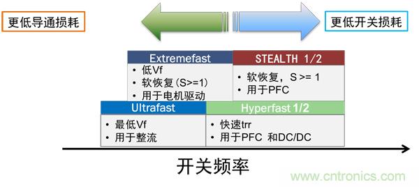根據不同的應用,整流器可選擇更低導通損耗或更低開關損耗的產品,各類產品的主要特點及應用如圖2所示。
