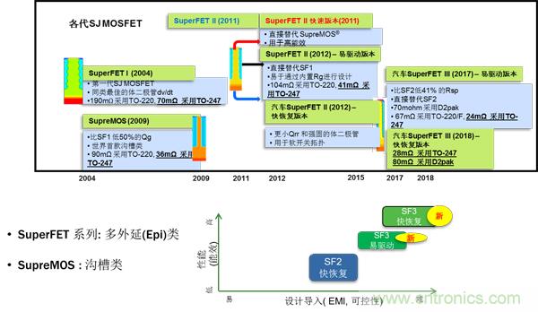 SJ MOSFET是利用電荷平衡技術實現出色的低導通電阻和低柵極電荷性能、從而最小化導通損耗并提供出色的開關性能的新型MOSFET。圖3所示為650 V SJ MOSFET技術演進。