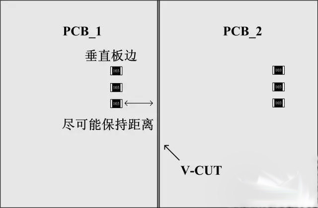 貼片電阻的另外一種常見的損壞是機械損傷后呈開路狀態(tài),后續(xù)導(dǎo)致電路異常(器件外觀有可能正常)。下面是幾個小建議:1、如果是手折板的話(極少使用,無法機器分析,毛刺大),貼片電阻長度方向平行于PCB板邊,零件受的應(yīng)力小;如果是V-CUT的話,貼片器件長度方向垂直于PCB邊,零件破裂可能性較小。2、元件如果與連接處垂直,到連接處的距離建議要≥4mm,若平行,距離建議要≥1.5mm.3、在成本允許的情況下,適當(dāng)加厚PCB板厚度,特別是面積比較大的板子。(下面是兩個簡單的示意圖,實際情況請實際分。)