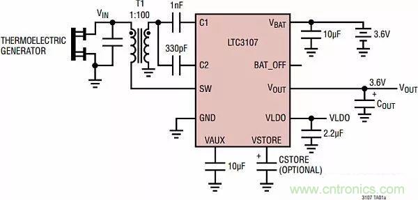 凌力爾特公司有一種基于LTC3107的能量采集解決方案,可用于給無(wú)線系統(tǒng)網(wǎng)絡(luò)和充電電池進(jìn)行供電,見(jiàn)圖16。
