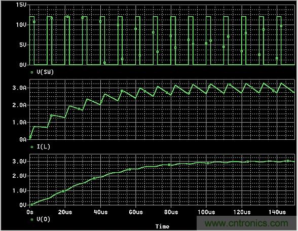 由于0 < D < 1,很明顯電路可以作為一種分壓器,不管負(fù)載RL所需的電流如何,公式(1)都保持不變。最初,電感電流的一大部分對(duì)C進(jìn)行充電,電路一旦達(dá)到穩(wěn)定狀態(tài),電容電流將平均為零,因此電感提供的平均電流IL等于負(fù)載要求的平均電流IO。在上面的例子中,IL= IO= VO/RL= 3A。