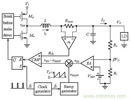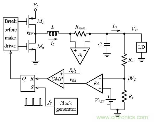圖3:不帶斜率補(bǔ)償?shù)腜CMC降壓轉(zhuǎn)換器的電路原理圖。