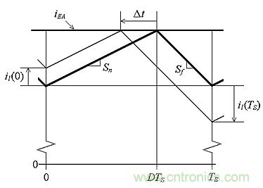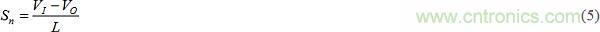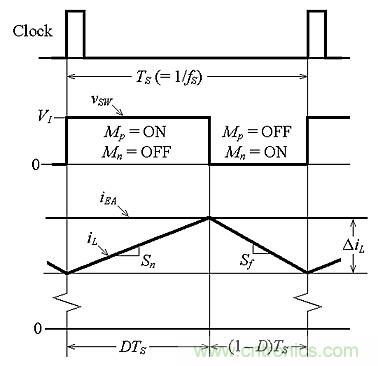 當(dāng)一個(gè)時(shí)鐘脈沖置位觸發(fā)器時(shí),開(kāi)始一個(gè)周期。這將關(guān)閉Mp開(kāi)關(guān),使vSW=VI。在該周期的這一部分(在圖4中表示為DTS),電感器電流iL以斜率Sn上升,由iL-vL電感法則掌控,或Sn=diL/dt=vL/L。在這段時(shí)間,我們得到vL=VI– VO,所以: