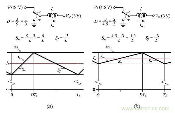 圖3所示電路存在兩個(gè)缺陷。第一個(gè)缺陷如圖5所示,是將VO調(diào)節(jié)為3.0V的轉(zhuǎn)換器設(shè)計(jì)(為簡(jiǎn)單起見(jiàn),假設(shè)周期在t = 0時(shí)開(kāi)始)。圖4a示出了在VI=9V條件下,穩(wěn)態(tài)電感器電流iL和其平均值IL,對(duì)應(yīng)于D = 3/9 = 1/3的占空比。假設(shè)現(xiàn)在VI下降到4.5V,則對(duì)應(yīng)D = 3 / 4.5 = 2/3的占空比。假設(shè)vEA沒(méi)時(shí)間發(fā)生顯著變化,那么平均電感器電流iL將增加,如圖5b所示。這是因?yàn)楫?dāng)下坡Sf在-3/L保持恒定時(shí),上坡Sn從(9-3)/L減小到(4.5-3)/L,即從6/L減少到1.5/L。