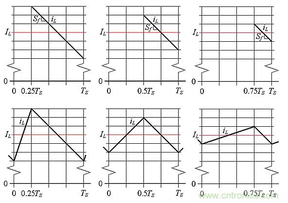 回來(lái)看圖5,我們觀察到,如果希望圖5b保持與圖5a相同的iL值,需要減小圖5b的iEA值,以便“下壓”iL波形,直到各IL對(duì)齊。那么, iEA需要減到多少呢?為了回答這個(gè)問(wèn)題,需要畫(huà)出三個(gè)不同D值所需的iL波形。如圖7所示,我們從頂部繪制iL的下降斜坡開(kāi)始,以相同的IL為垂直中心,并且全具有相同的斜率Sf=-VO/L。接下來(lái),通過(guò)繪制上行斜坡來(lái)完成iL波形,如圖7底部所示。最后,將這三張圖疊加,如圖8所示,并觀察到峰值軌跡斜坡的斜率為Sf/2 = –VO/2L。