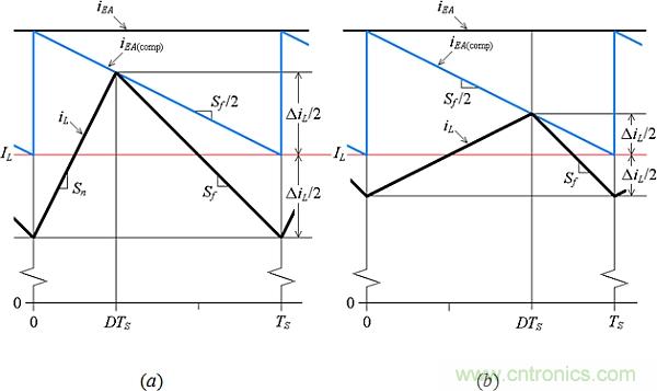 回到圖3,我們觀察到CMP比較器連續(xù)地將電壓RiiL與電壓vEA進(jìn)行比較,一旦RiiL達(dá)到vEA,CMP會(huì)復(fù)位觸發(fā)器。兩邊除以Ri,相當(dāng)于說(shuō),一旦iL達(dá)到這個(gè)值,CMP就動(dòng)作: