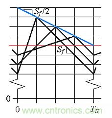 第二個(gè)缺陷是稱為次諧波振蕩的不穩(wěn)定形式,當(dāng)D>0.5時(shí)會(huì)產(chǎn)生這種不穩(wěn)定。圖6顯示了周期開(kāi)始時(shí)電感電流擾動(dòng)il(0)如何在周期結(jié)束時(shí)演化為擾動(dòng)il(TS)。例如,擾動(dòng)可能由前一周期中比較器失能引起。借助簡(jiǎn)單的幾何,我們可以得出il(0)/△t = Sn和il(TS)/△t = Sf。消除△t,得出: