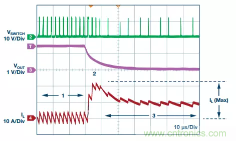 最初,峰值電感電流由選定的電感值、電源開(kāi)關(guān)導(dǎo)通時(shí)間、電路的輸入和輸出電壓以及負(fù)載電流設(shè)置(圖中用“1”表示)。當(dāng)電路短路時(shí),電感電流迅速上升,直至達(dá)到限流點(diǎn),即 RS × IINDUCTOR (IL)等于最大電流檢測(cè)電壓,以保護(hù)器件和下游電路(圖中用“2”表示)。然后,內(nèi)置電流折返限制(圖中數(shù)字“3”)進(jìn)一步降低電感電流,以將熱應(yīng)力降至最低。