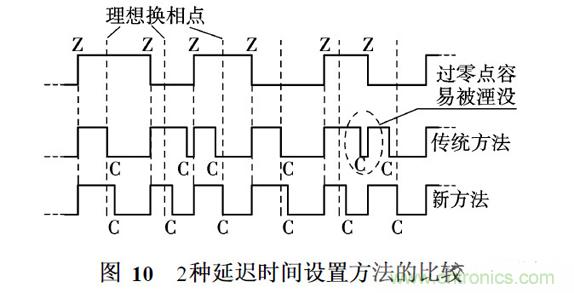 當(dāng)三相反電動(dòng)勢(shì)波形的間隔時(shí)間長度不是理圖11 新的延遲時(shí)間設(shè)置方法想的120°電角度,過零點(diǎn)間隔時(shí)間不相等時(shí),采用新的延遲時(shí)間設(shè)置方法可以使換相更為準(zhǔn)確,換相點(diǎn)落在前后2個(gè)過零點(diǎn)的中間位置,過零點(diǎn)不容易被湮沒,電機(jī)運(yùn)行不易失步,如圖10所示. 特別是在電機(jī)高速運(yùn)行時(shí),新方法提高了電機(jī)運(yùn)行的可靠性,實(shí)驗(yàn)很好地驗(yàn)證了新方法的可行性和有效性.