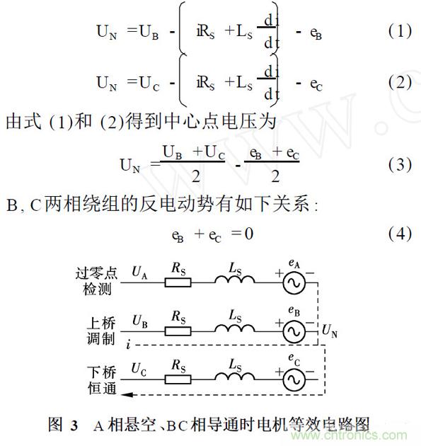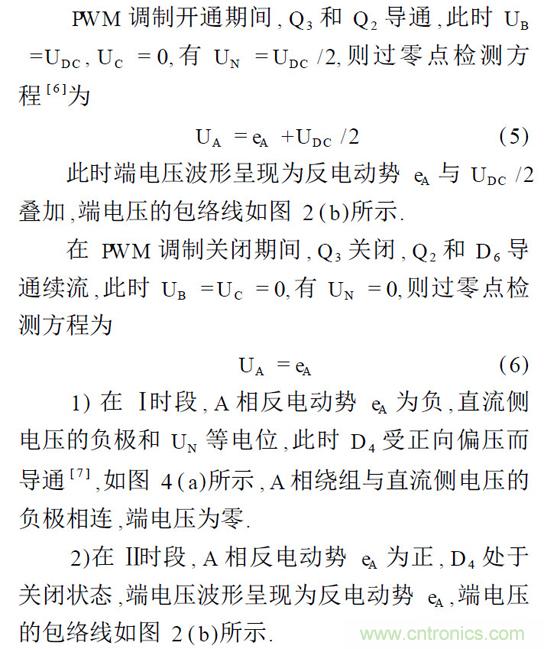 提出了在on _pwm 調(diào)制方式時(shí)的反電動(dòng)勢(shì)過零點(diǎn)檢測(cè)方法,采用內(nèi)置AD 的微控制器在PWM開通時(shí)檢測(cè)懸空相端電壓,軟件算法中使用簡單的代數(shù)運(yùn)算,獲得準(zhǔn)確的過零點(diǎn)信號(hào). 目前,關(guān)于反電動(dòng)勢(shì)法的研究多集中在反電動(dòng)勢(shì)過零點(diǎn)的檢測(cè)電路方法和由濾液電路引起的相位誤差的消除或補(bǔ)償方法,但在準(zhǔn)確換相方面的研究尚不夠深入.