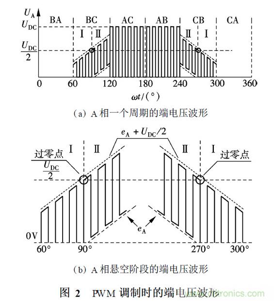 無刷直流電機(jī)控制可以采用多種PWM 調(diào)制方式. 采用的調(diào)制方式不同, 呈現(xiàn)的端電壓波形也不同. 本文采用上橋臂PWM 調(diào)制,下橋臂恒通(H _pwm 2L _on )的調(diào)制方式. 以A 相為例, 假設(shè)PWM 占空比為50% ,忽略高頻開關(guān)噪聲和換相續(xù)流產(chǎn)生的脈沖毛刺,理想的端電壓波形如圖2 ( a)所示. 在一個(gè)周期范圍內(nèi),將A 相端電壓波形劃分為BA, BC, AC, AB, CB 和CA 六個(gè)區(qū)域,每個(gè)區(qū)域?qū)?yīng)一個(gè)工作狀態(tài). 端電壓波形的上升部分和下降部分為BC區(qū)和CB 區(qū),此時(shí)A 相處于懸空狀態(tài).