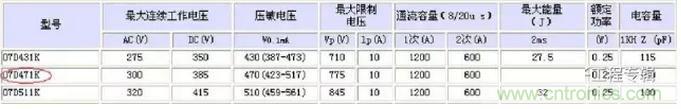 結合前面所述,來看一下本電路中壓敏電阻的型號所對應的相關參數。