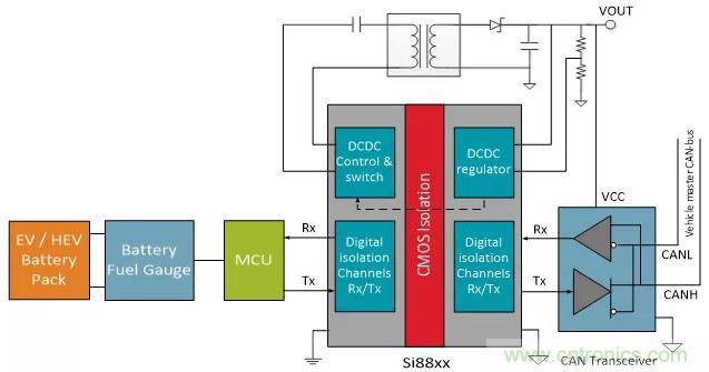 如圖3所示,這個簡化的BMS系統(tǒng)展示了在與一個EV子系統(tǒng)進行連接時信號和電源隔離的重要性。在大多數(shù)EV子系統(tǒng)中,CAN總線通過數(shù)字隔離與該子系統(tǒng)中的高壓隔離。現(xiàn)代數(shù)字隔離兩側(cè)各需要一個電源為隔離器供電(高壓域和低壓域)。該電源也可為連接到隔離器的其他設備供電,例如CAN總線收發(fā)器。