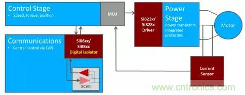 這些系統(tǒng)需要在馬達控制器和功率晶體管之間采用隔離驅(qū)動器。隔離允許低壓控制器安全地開關高功率晶體管以產(chǎn)生交流波形。此外,馬達控制系統(tǒng)中可能存在隔離的CAN總線,并且有某些方法可以感測驅(qū)動馬達的電流,以監(jiān)控速度和轉(zhuǎn)矩。圖4展示了一個使用一系列數(shù)字隔離設備的簡化的牽引馬達控制系統(tǒng)。